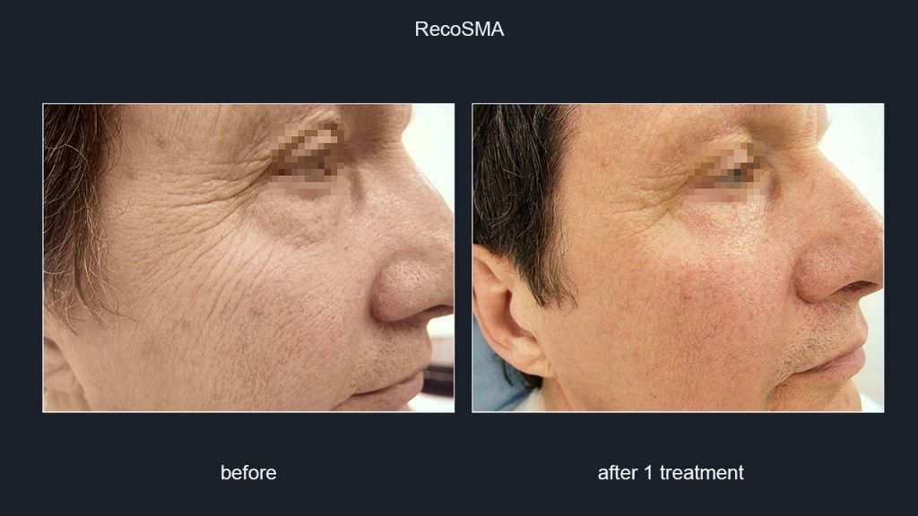 RecoSMA™ , the new deep-impact method for skin restoration and rejuvenation, is based on the erbium laser’s effect. Upon passing through a special SMA nozzle, the laser beam is spatially divided so that when it reaches the skin, it results in insignificant microablation on the epidermal surface and multiple areas of microdamage in the deeper layers of the epidermis, dermis, and subcutaneous cellular structure.